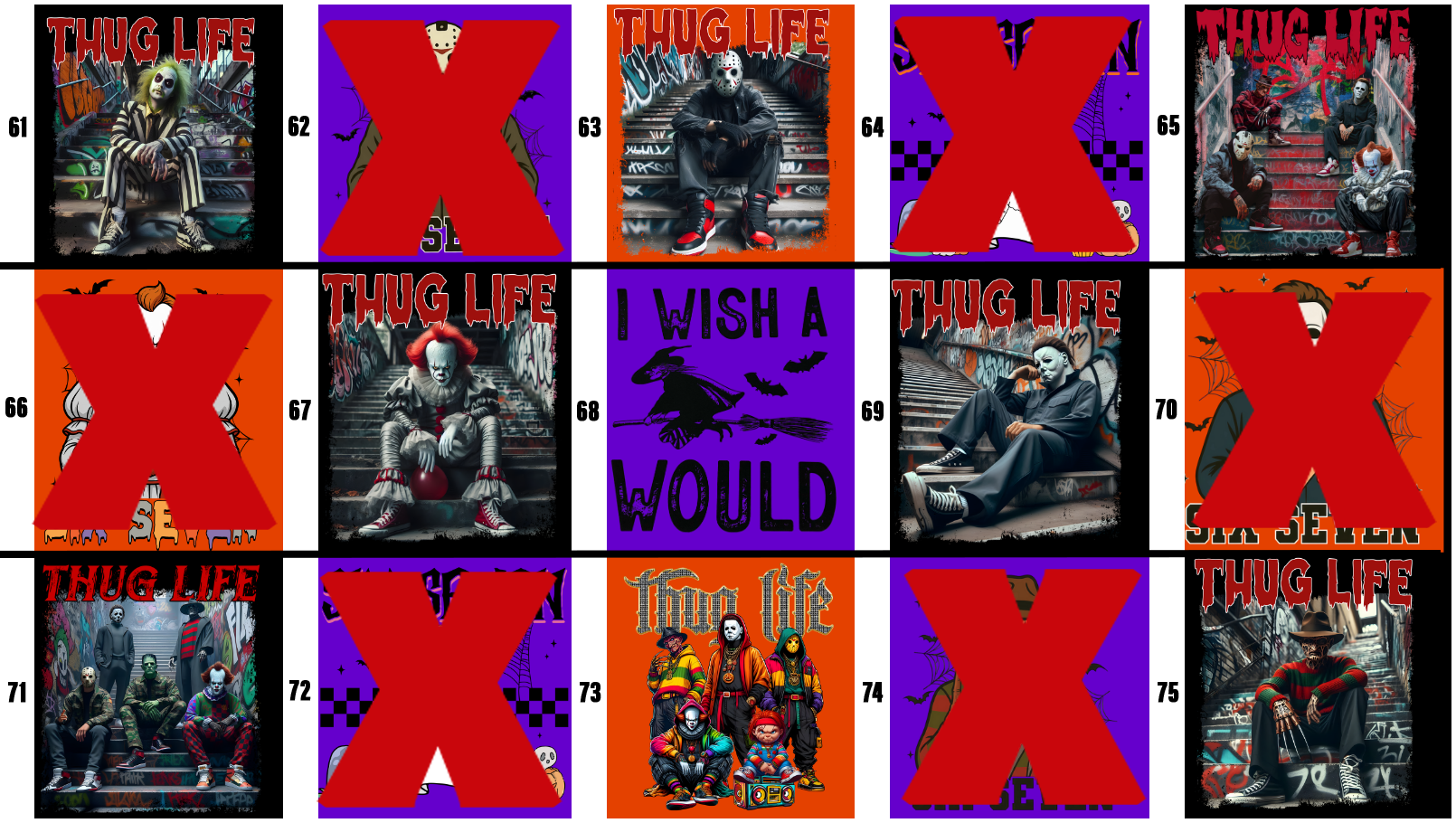 - Top Row- 16. Thug Life 5 Villains , 17. Straight Outta Nightmares (Landscape) , 18. NBC Boogie Man 19. Thug Life Loco 20. Chingona Chucky